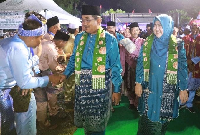 TANJAB BARAT, JN – Bupati Tanjung Jabung Barat, Drs. H. Anwar Sadat, M. Ag., didampingi Ketua TP PKK Kabupaten, Hj. Fadhilah Sadat, menghadiri acara pembukaan Musabaqah Tilawatil Quran (MTQ) ke-53 Tingkat Kabupaten Tanjung Jabung Barat Tahun 2025 yang diselenggarakan di lapangan sepak bola Desa Tanjung Bojo Kecamatan Batang Asam, Kamis Malam (28/8).