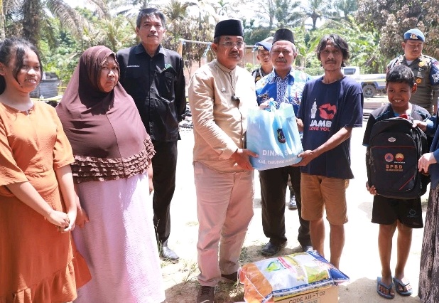TANJAB BARAT, JN – Musibah kebakaran yang melanda pemukiman warga di Desa Purwodadi, Kecamatan Tebing Tinggi, mendapat perhatian langsung Bupati Tanjung Jabung Barat, Drs. H. Anwar Sadat, M.Ag. Didampingi Ketua TP-PKK, Ny. Hj. Fadhilah Sadat, Bupati menyambangi lokasi sekaligus menyerahkan bantuan berupa sembako, selimut, dan tas sekolah kepada korban, Edi Purwanto, Kamis (28/8).