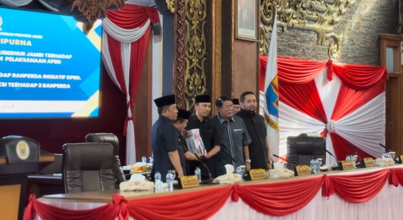 Jambi – DPRD Provinsi Jambi menggelar rapat paripurna dengan tiga agenda pembahasan yakni penyampaian nota pengantar Gubernur Jambi terhadap Ranperda pertanggungjawaban pelaksanaan APBD Provinsi Jambi Tahun Anggaran 2023. Penjelasan pimpinan DPRD terhadap Ranperda Inisiatif DPRD serta Pemandangan Umum Fraksi-fraksi terhadap dua Ranperda, Jumat (5/7) di Ruang Rapat Paripurna DPRD Provinsi Jambi.