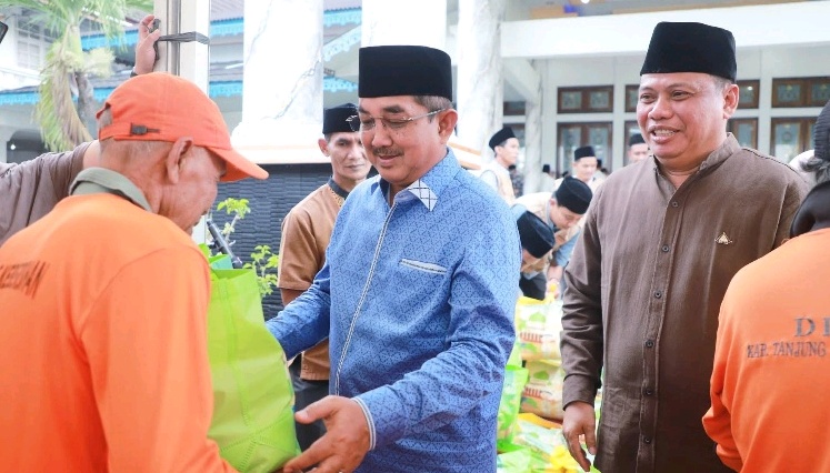 TANJAB BARAT, JN – Ada pemandangan berbeda di Rumah Dinas Bupati Tanjung Jabung Barat, Minggu (08/03). Puluhan petugas penyapu jalan berkumpul untuk menerima tali asih berupa paket sembako dalam rangka menyambut Bulan Suci Ramadan.